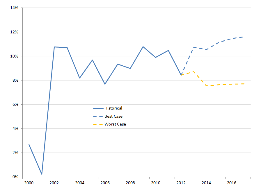Iron Mountain’s economic profit has been consistently high, despite the pressure on the top line. Recently, a U.S. hedge fund mounted a proxy battle to change management policy, and to us, it seems as if their challenge to management has resulted in a more rational attitude toward growth and profitability, with the company coming down more on the side of the latter. Another change prompted by the hedge fund was the ongoing plan to convert at least part of its operations to a REIT structure rather than a C-Corporation. Preparation for this adjustment resulted in changes to asset and liability accounts which impact our calculation of economic profits in 2012. Adjusting for this non-material artifact, we estimate the historical level of profitability at Iron Mountain to be between 8% and 11% of revenues. We believe that, considering the trend toward more rational investment practices, there is a relatively good case to be made to assume that the average level of economic profits will reset relatively higher in the short- to medium-term.